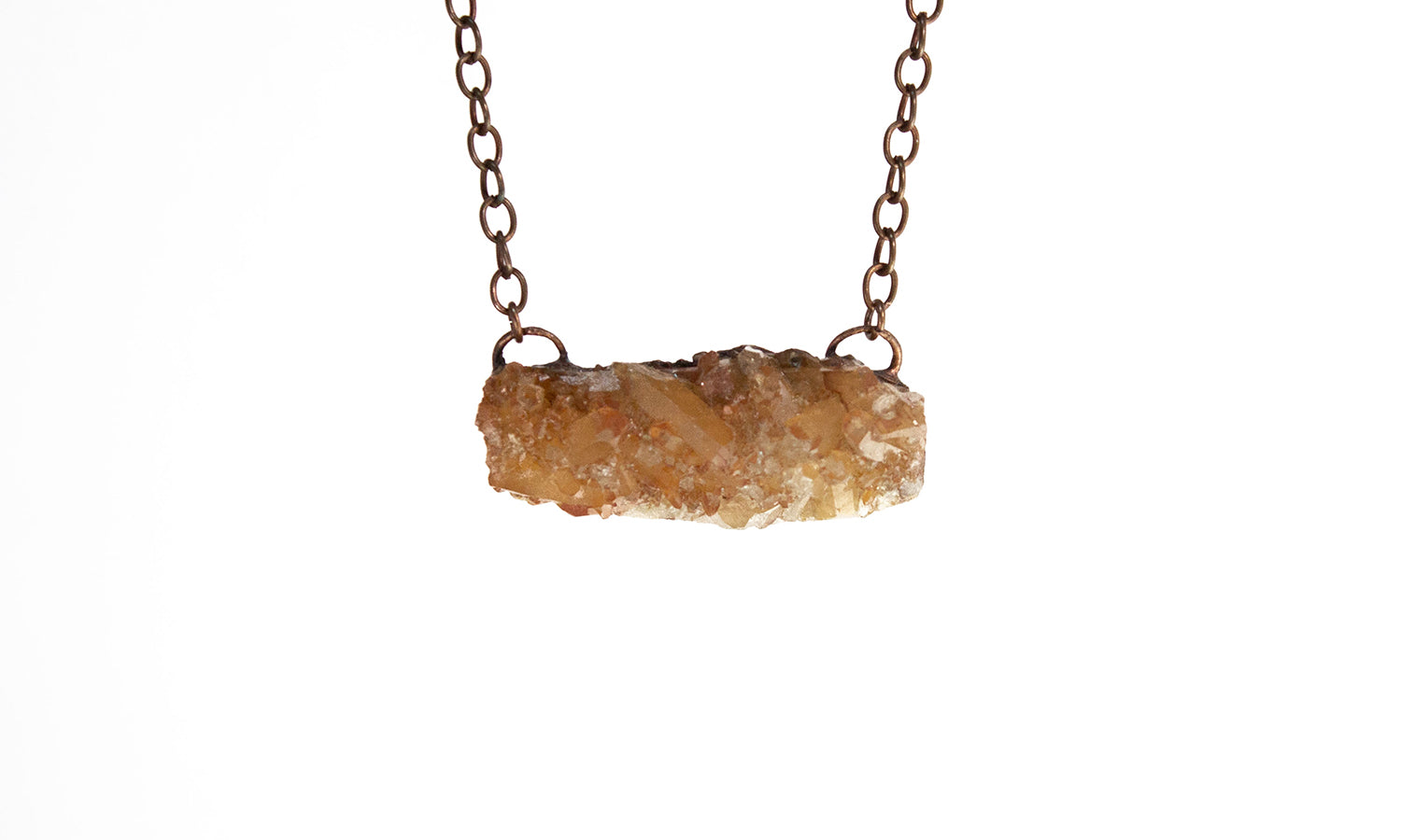 This pendant is made featuring a natural tangerine quartz cluster and is electroformed with pure copper!